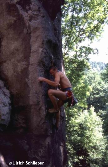 Hinrich Baumgart in einer historischen Aufnahme in “Face to face” 8 am Feldhofstein im Hönnetal. Das Gebiet liegt bei Hemer im Sauerland. Das ist in Nordrhein-Westfalen, daher ist das Gebiet heute auch weitestgehend fürs Klettern gesperrt. Leider! “Face to face” leitet an kleinen abschüssigen Griffen in wackeliger Kletterei über einen Pfeiler. Als Abschluß kann man, pardon: konnte man, noch den Nasenüberhang im Grad 7+ dranhängen, was eine richtig zünftige Route von 25 Metern ergab.