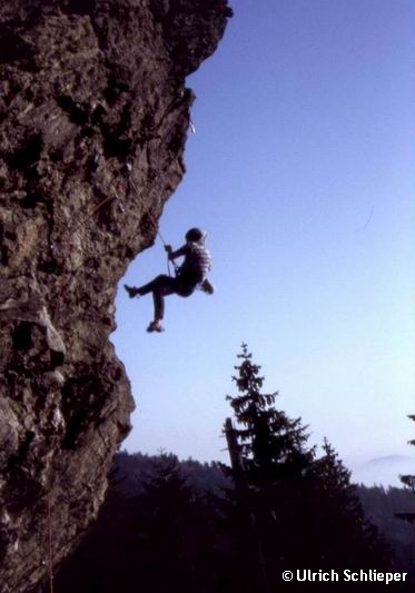 Kletterer beim Sturzflug in der Route “Sturzflug” 8- an den Rauchröhren am Kaitersberg im Bayerischen Wald.