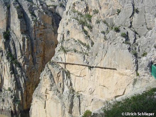 Die Schlucht von El Chorro in Andalusien, Spanien. In der Mitte erkennt man den Beginn des Camino del Rey, der durch die ganze Schlucht führt. Beginn und Ende des Steigs wurden zerstört.