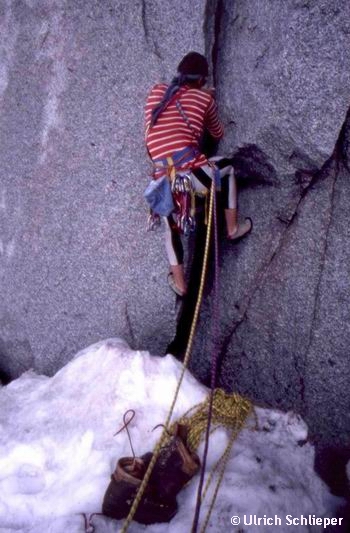 Hinrich am Einstieg von “Conquest” 8- an der Grauen Wand. Diese Stelle war gar nicht so leicht, wie es vielleicht aussieht. Man beachte die schweren