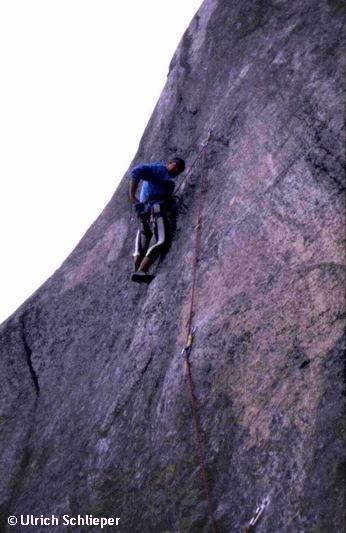 Hinrich in unserer Neuroute “Dosenfraß” 8-. Während eines Kletterurlaubs in der Schweiz machte uns das Wetter dermaßen einen Strich durch alle Kletteraktivitäten, dass wir in unserer Verzweiflung teilweise im strömenden Regen zwei neue Routen einbohrten. Diese fantastischen Klettereien liegen an der Grimselpass-Straße links der Gelmerfluh, zu erreichen vom vielleicht bekannten Parkplatz Chüenzentennlen. Rechts von “Dosenfraß” gibt es noch die “Flatulenz” 7, eine herrliche Platten- und Risskletterei.