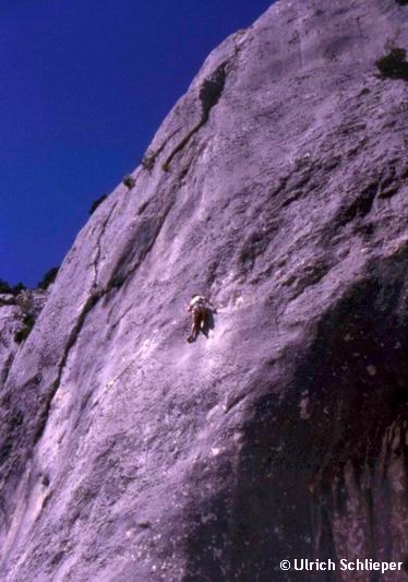Verdon, Mirroir du Fou. Eines der wenigen Feiglings-Massive im Verdon, da man hier nicht vor Beginn der Kletterei in die Schlucht abseilen muß. Echtes Verdon-Feeling kommt hier aber nicht auf. Dafür ist der Fels leichter zu fotografieren.