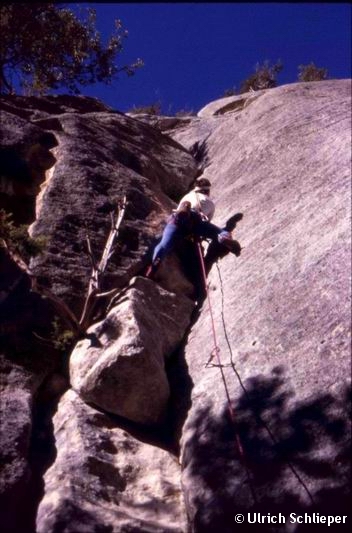 Wolfgang Göschl in “La Marabunta” 6a, einer klassischen Route in Buoux. Wer mehr über den Österreicher Wolfgang und meinen ersten Buoux-Aufenthalt erfahren möchte, dem empfehle ich, in der Geschichte “Buoux” nachzulesen. Natürlich hier, bei www.kleimbing.de.