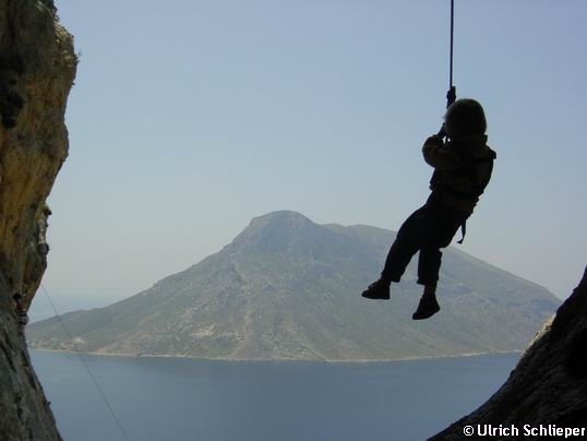 Laura (3 Jahre) baumelt vor Telendos, dem “versunkenen Matterhorn”. Das Seil hängt übrigens im Umlenker von “Fouska”.