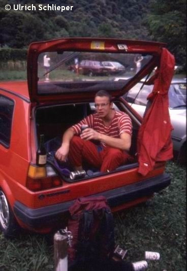 Hinrich betrunken im Kofferraum meines Autos auf einem Zeltplatz im Tessin bei Avegno, nachdem uns auch dort der Regen eingeholt hatte.